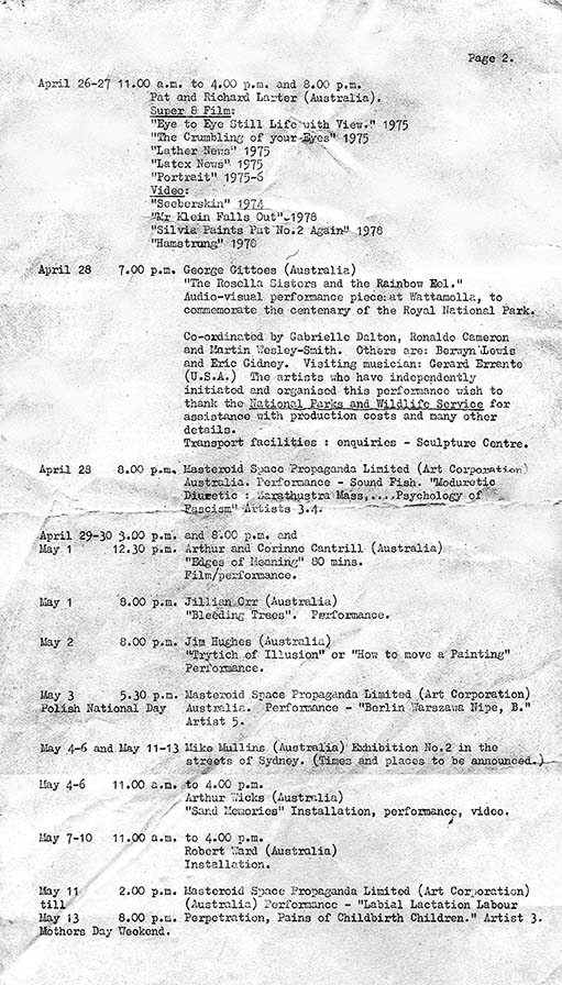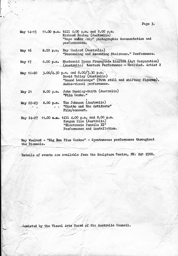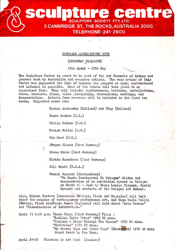 This document lists the "Biennale Alternatives"; works shown at the Sculpture Centre associated with the Sydney Biennale 1979.